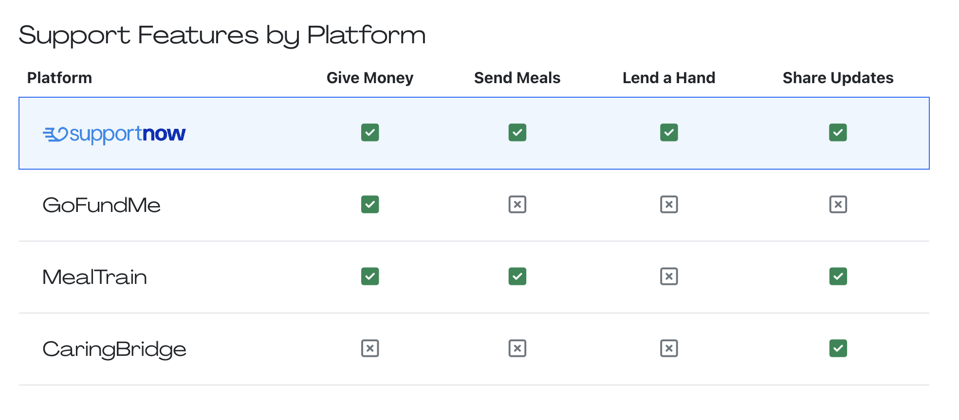 SupportNow allows supporters to help families in tough times. Through a single online experience, supporters can direct their compassion in meaningful ways.